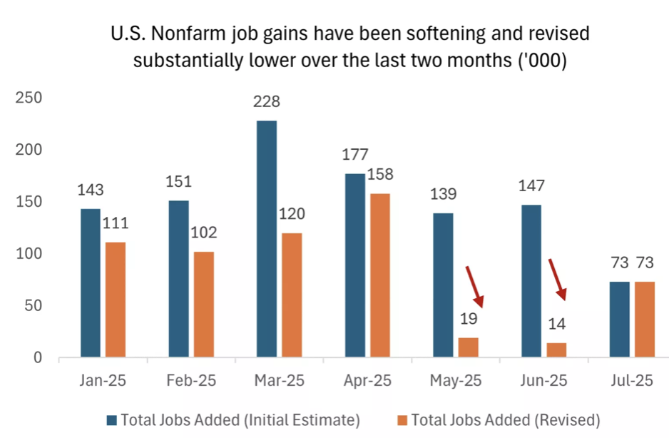 In our view, the sizable downshift in the jobs data indicates that the U.S. economy may be entering a softer