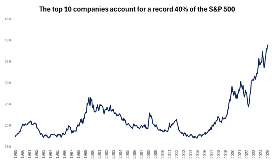 but also creating unprecedented market concentration. Today, the top 10 stocks account for over 40% of the S&P