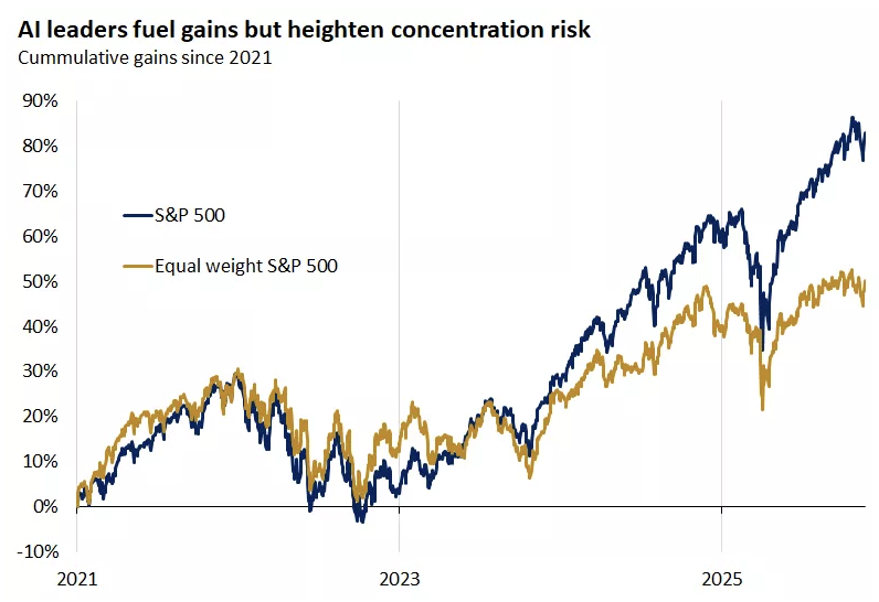 as overconcentration, stretched valuations, and potential disappointment if AI adoption falls short of expectations.