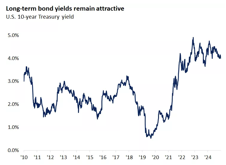 two-year range, around 4.0%, down from this year’s peak of 4.8%. Despite the recent pullback, yields remain