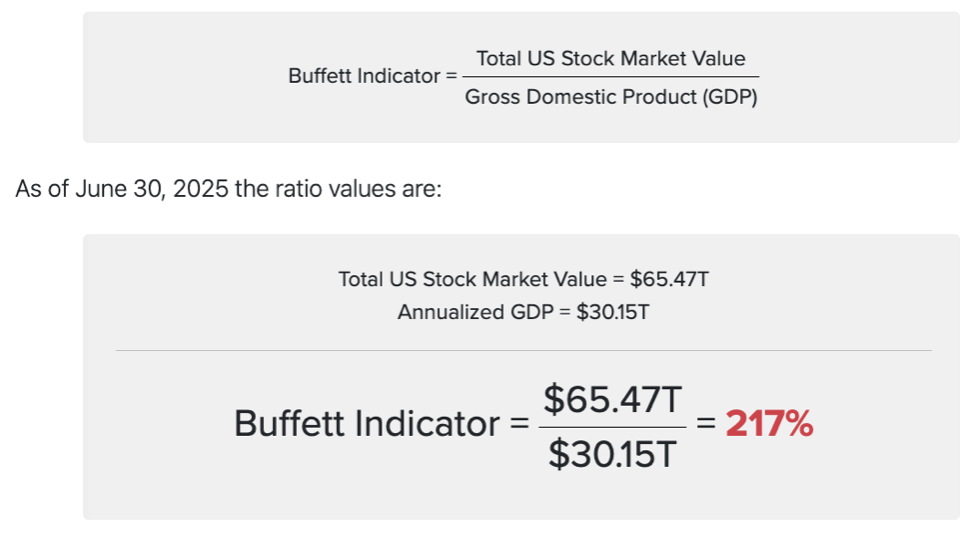 The Buffett Indicator (aka, Buffett Index, or Buffett Ratio) is the ratio of the total United States stock market to GDP.