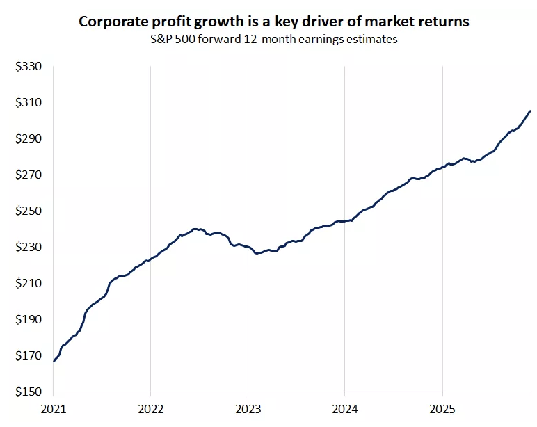 GDP growth, with S&P 500 profits on track to rise about 11% year-over-year and profit margins holding near