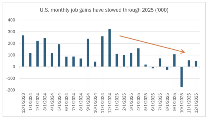 Overall, the U.S. labor market seems to paint the same sluggish picture we saw for much of last year. December's jobs growth came in at 50,000, below estimates of 70,000. Notably, the prior two months' figures were revised lower by 76,000, bringing the three-month average to -22,333 in monthly job gains. More broadly, the 2025 average monthly job gains were just 49,000, well below the 2024 average of 168,000.