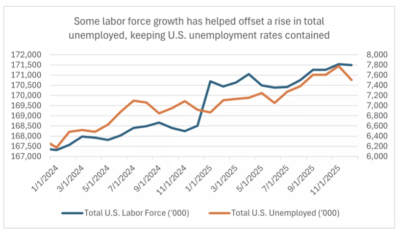 While we are seeing a clear slowdown in job growth in the U.S., the silver lining is that the unemployment rate remains steady at 4.4% in December, versus forecasts of 4.5%. The U.S. labor force has seen marginal growth in 2025, despite headwinds from immigration reform and aging demographics. However, the number of unemployed has also risen, though labor force growth has kept the unemployment rate contained at 4.4%. Historically, the longer-term average U.S. unemployment rate is close to 5.5%.