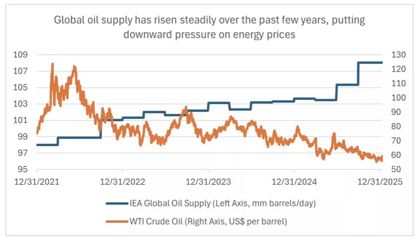 Overall, while the first few days of 2026 have been eventful—from a geopolitical, economic data, and policy perspective—we think the good news is that markets remain focused on key drivers. U.S. earnings growth has been revised higher for 2026 to about 14.7% year-over-year, driven by a broad set of sectors. Economic growth continues to deliver, with fourth-quarter U.S. GDP forecast at around 5.1% by the Atlanta Fed GDPNow model, well above trend rates of around 2.0%*. As a result, the S&P 500 is up about 1.9% in 2026 thus far, while the U.S. 10-year Treasury yield offers around 4.15%.