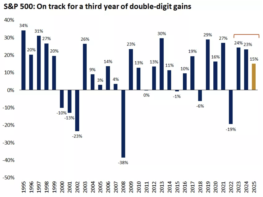 The S&P 500 is on track for a third consecutive year of double-digit returns, up about 15%, despite a near