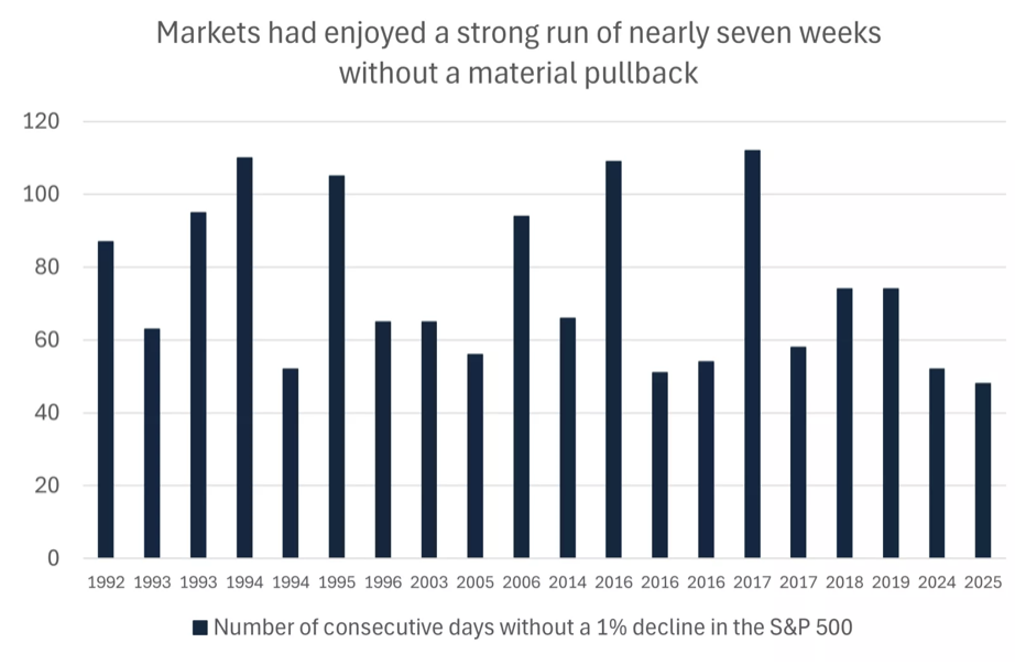 hadn't seen a 1% daily decline in nearly 50 days. Over the past 25 years, there have only been 12 longer streaks.