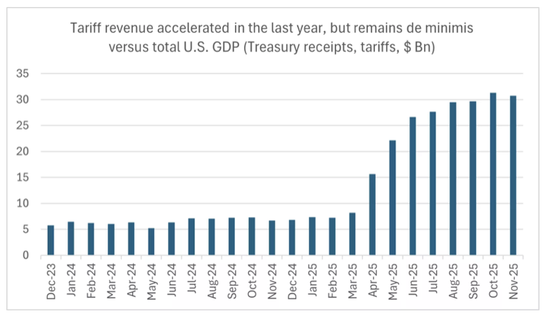 Third, even if refunds are issued, the roughly $150 billion is negligible relative to the $38 trillion U.S. federal debt and the roughly $30 trillion U.S. GDP in 2025. While additional money in the system may create some inflationary pressure, it could also bolster economic activity and support ongoing GDP and earnings growth.